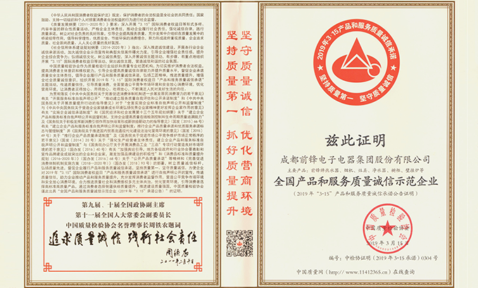 從中國質量檢驗協(xié)會傳來喜訊,成都前鋒電子電器有限股份公司榮獲“全國產品和服務質量誠信示范企業(yè)”榮譽稱號。