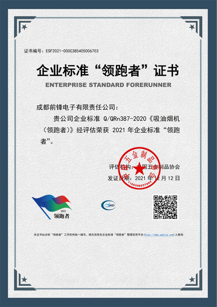 前鋒2021企業(yè)標(biāo)準(zhǔn)“領(lǐng)跑者”證書