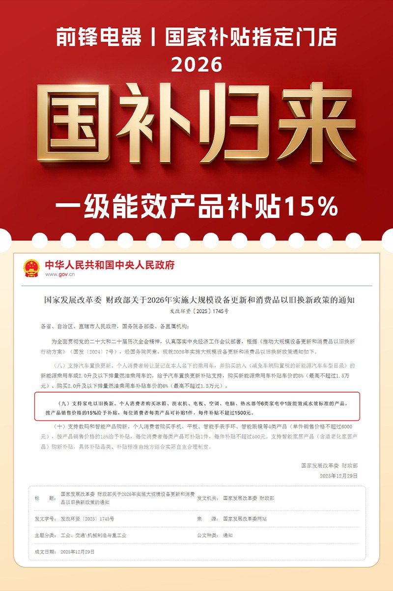 新年煥新,溫暖升級,2026年國補(bǔ)政策榮耀回歸!前鋒再次入選國家指定補(bǔ)貼單位,為您的品質(zhì)生活助力!更重磅的是,前鋒推出“新春廠補(bǔ)”,誠意拉滿,補(bǔ)貼不打折、不套路,雙線補(bǔ)貼,15%直降,讓您一次購齊,暖意全開!